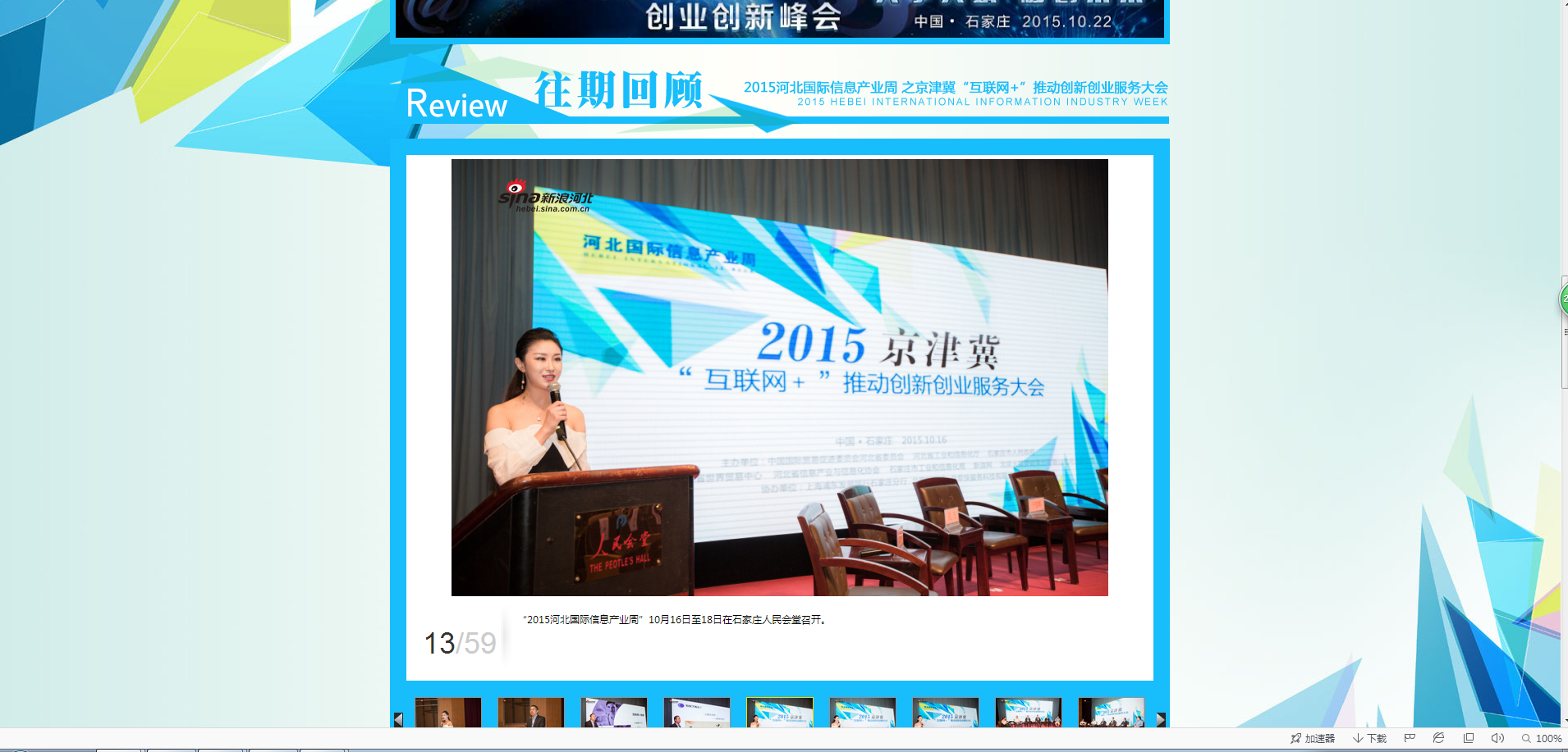 2015河北国际信息产业周”10月16日至18日在石家庄人民会堂召开。本次产业周旨在顺应划入国家战略的“互联网+”及“双创”大潮,致力于打造北方最具影响力的综合性信息产业与信息化相结合的大展+大会。实现思维与行动对接、技术与服务融合、大咖与粉丝同台、创投与创客双赢,助力河北经济蓬勃发展!
